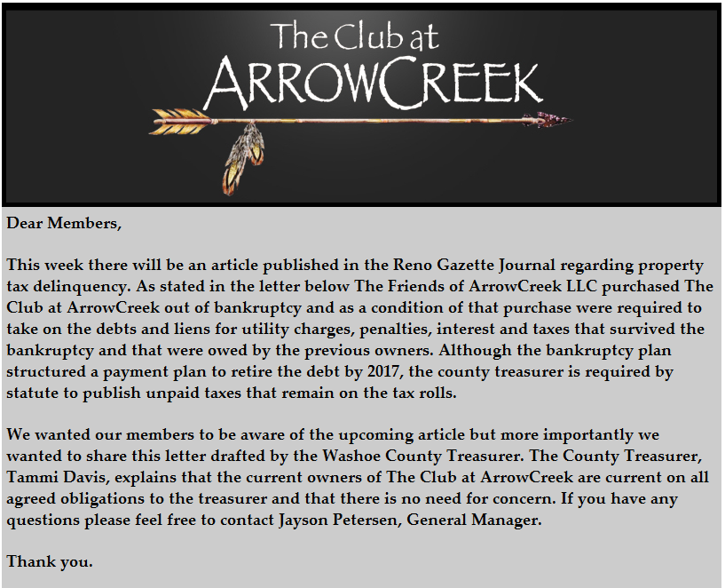 Yesterday’s Reno Gazette Journal had a pull-out listing of Washoe County properties that were delinquent in property tax payments. There were 8 properties listed naming the Friends of ArrowCreek owing a total of $171,775.36 in 2014 back taxes. In response to a Concerned Neighbor of ArrowCreek (CNA) member, one of the co-chairs of the ArrowCreek Homeowners’ Association (ACHOA) Communications Committee forwarded the referenced Washoe County Treasurer letter to the Board for posting on the ACHOA website. This is information about the ongoing golf course debt issues created by Aspen Sierra and the work that the FOA are doing to retire those debt obligations.