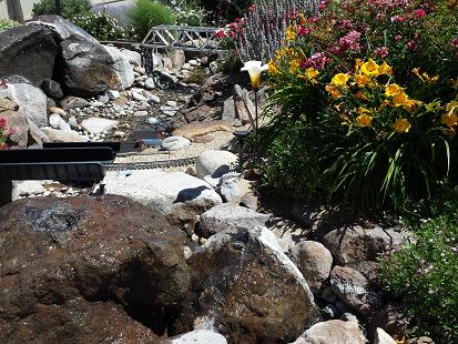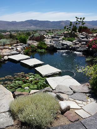Stu & Rose Sandidge have a 5,000-gallon oval pond surrounded by large rocks. Two streams and waterfalls are each powered by a ½ HP pump. Four large steps lead across the pond. The full, sweeping, west-to-north-to-eastern view of the valley is stunning. It is a wonderful, relaxing place hidden above ArrowCreek Parkway.