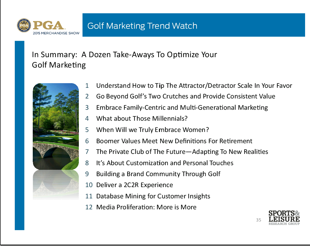 Golfers can be segmented into various behavioral segments and how to market to them. From The PGA Show held January 2015, here are two presentations that our ArrowCreek golfers should find very insightful.