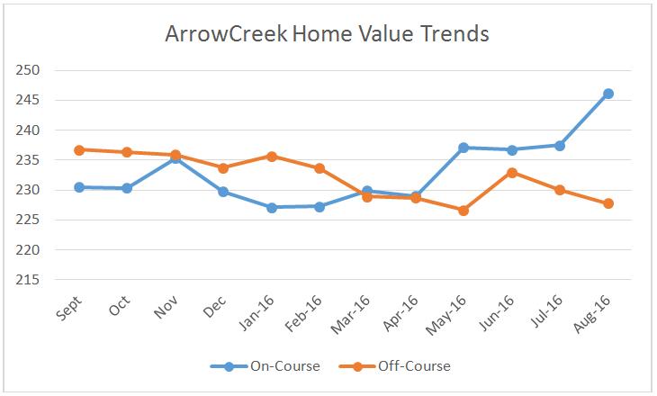 f.) As charted in the figure below, the trends for our property values indicate that over the past twelve months of tracking, the values of homes off the golf course have declined at a fairly consistent rate. In the meantime, homes on the golf course have appreciated significantly over the past year. It’s also clear from the chart below that ArrowCreek had a ‘soft patch’ between November and April that continued for homes not on the golf course thru May. The market continues to strengthen and that bodes well for our community.