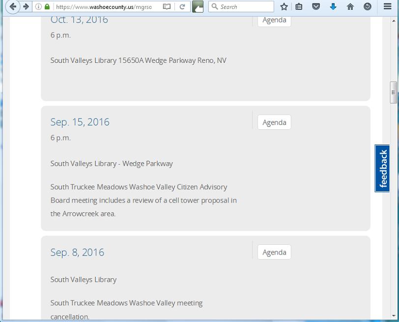 The cancelled September 8th South Truckee Meadows/Washoe Valley Citizen Advisory Board Meeting was apparently rescheduled with no fanfare, postcards or email notice for September 15, 2016, at 6:00 P.M. at the Galena High School Library on 3600 Butch Cassidy Dr (versus the normal meeting place of the South Valleys Library which is today still actually stated on the website) in Reno, with only one item on the agenda – The Arrowcreek Cell Tower: stmwvcab09152016finalagenda