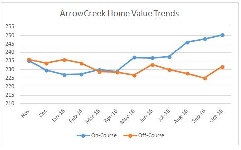 1. ArrowCreek properties have moved to be in a competitive premium class within Washoe and Douglas Counties. However, as you read this report you will see that prices have improved for properties on the golf course while prices for homes, especially non-custom, not on the golf course have declined over the past five months, to values comparable to those in non-gated communities.