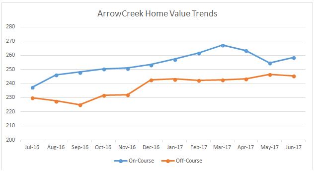 1. ArrowCreek properties have stayed in the premium class within Washoe and Douglas Counties. As you read this report you will see that prices have improved for properties on the golf course, with an average appreciation rate of 8.9% over this past year, while prices for homes not on the golf course have also trended upward with an increase of 6.7% over the same period, with the ‘hottest’ neighborhood being Granite Point I. Given round-off factors, these values are right in line with Reno-Sparks price increases as reported by the Reno Gazette Journal on Sunday, 25 June 2017.