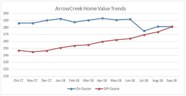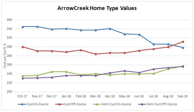 The available data shows that we continue in the in the thick of the market with an additional ten (10) properties changing owners during this reporting period. This is at the same level as last month and still going strong, likely reflecting the economy as a whole. Custom homes on the Golf Course (Non-Residential area) now exhibit only a 0.2% premium to custom homes not on the course. In the mean time, semi-custom homes not on the course are a 0.5% higher than those abutting the course. This, of course, leads to the question of ‘What are the value propositions for ArrowCreek properties?’ One of the key ‘propositions’ is that ArrowCreek owners have the option to join ‘The Club at ArrowCreek’ or not to join – an individual choice of freedom versus other gated communities.