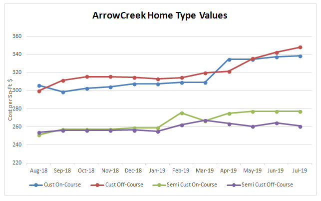 Continuing with the Commentary from previous months: the author received queries about semi-custom and custom homes both on and off the golf course and their relative selling prices. The following chart portrays the trend lines for Custom and Semi-Custom homes within our community.