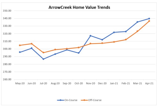 d.) The figure below shows the value trends over the past twelve months with the vertical scale being the cost per square foot. It should be noted that since July of 2020 prices have been steadily increasing across the ArrowCreek market.
