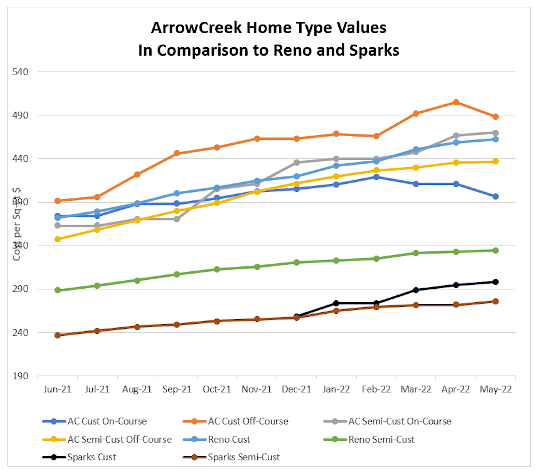 Continuing with the commentary from previous months: the author received queries about Semi-Custom and Custom homes both on and off the golf course and their relative selling prices with respect to those found in Reno and Sparks. The following chart portrays the trend lines for Custom and Semi-Custom homes within this broader community. From the chart it is clear that home values have been steadily increasing since June 2021. Furthermore, values of Custom homes within Truckee Meadows, especially those in Reno and on the ArrowCreek golf course, have managed to exhibit nearly the same values along with ArrowCreek Semi-Custom homes, both on and off the golf courses. However, as noted in the opening, only one home sold on the golf course in the past 3 months. Also, the value of Semi-Custom homes, of comparable home and land size, indicate that both Reno and Sparks offer greater value per square foot than ArrowCreek from a pure price perspective but not from a secure and safe environmental perspective. ArrowCreek’s value lies in our views, gated security, quality of adjacent schools and our other amenities which amounts to a premium of about $70 per square-foot for our Semi-Custom homes. Obviously, this is not true for our Custom homes as we enjoy the same ambience, but there is little price difference between Reno Custom homes and Custom homes on the golf course. However, those ArrowCreek Custom homes not on ‘the course’ exhibit a $40 to $80 advantage to both internal and external Custom homes.