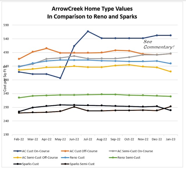 Continuing with the commentary from previous months: the author received queries about Semi-Custom and Custom homes both on and off the golf course and their relative selling prices with respect to those found in Reno and Sparks. The following chart portrays the trend lines for Custom and Semi-Custom homes within this broader community. From the chart it is clear that home values have been steadily increasing since February 2022. Furthermore, values of Custom homes within Truckee Meadows, especially those in Reno and within ArrowCreek, have managed to exhibit nearly the same value trends. Also, the value of Semi-Custom homes, of comparable home and land size, indicate that both Reno and Sparks offer greater dollar value per square foot than ArrowCreek from a pure price perspective but not from a secure and safe environmental perspective. ArrowCreek’s value lies in our gated security, views, quality of adjacent schools and our other amenities which amounts to a premium of about $50 per square-foot for our Semi-Custom homes. Obviously, this is not true for our Custom homes as we enjoy the same ambience, but there is little price difference between them and Reno Custom homes. ArrowCreek homes are $30 more expensive per square foot.