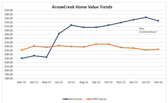 Welcome to the ArrowCreek monthly property value update for a High Desert, Semi-Rural community in Washoe County, Nevada, that was designed to incorporate an independent, PRIVATE Golf Course, commercial business (A.K.A. the Non-Residential Area as documented in the Articles of Incorporation, the Covenants, Conditions and Restrictions (CC&Rs) and By-Laws). Participation in the private club (i.e., HOA residents do not have a financial interest nor obligation to ‘The Club,’ which is not true for all Associations) is purely optional for interested and “approved” parties. The origins of this report were based on a heated discussion of the value of homes on a golf course versus those not on the golf course, which is likely different for other communities, and, as you’ll observe, the belief that homes on a course are worth more is a ‘belief,’ especially in this time of inflation, rising interest rates and decreasing sales.