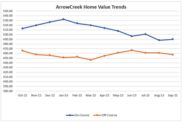 Welcome to the monthly update of the ArrowCreek community property values for our High Desert, Semi-Rural village within Washoe County, Nevada. The ‘village’ was designed to have 1,083 residences, a small residents center to include a 7/11 type store, real estate office, equestrian center and an independent, PRIVATE Golf Course as a commercial business (A.K.A. the Non-Residential Area as documented in the Articles of Incorporation, the Covenants, Conditions and Restrictions (CC&Rs) and By-Laws). The 7/11 type store and equestrian center were dropped from plans many, many years ago. Participation in the private club (i.e., HOA residents do not have a financial interest nor obligation to ‘The Club,’ which is not true for all Associations) is purely optional for interested and “approved” parties. The origins of this report were based on a heated discussion of the value of homes on a golf course versus those not on the golf course, which is likely different for other communities, and, as you’ll observe, the belief that homes on a course are worth more is a ‘belief,’ especially in this time of inflation and rising interest rates.