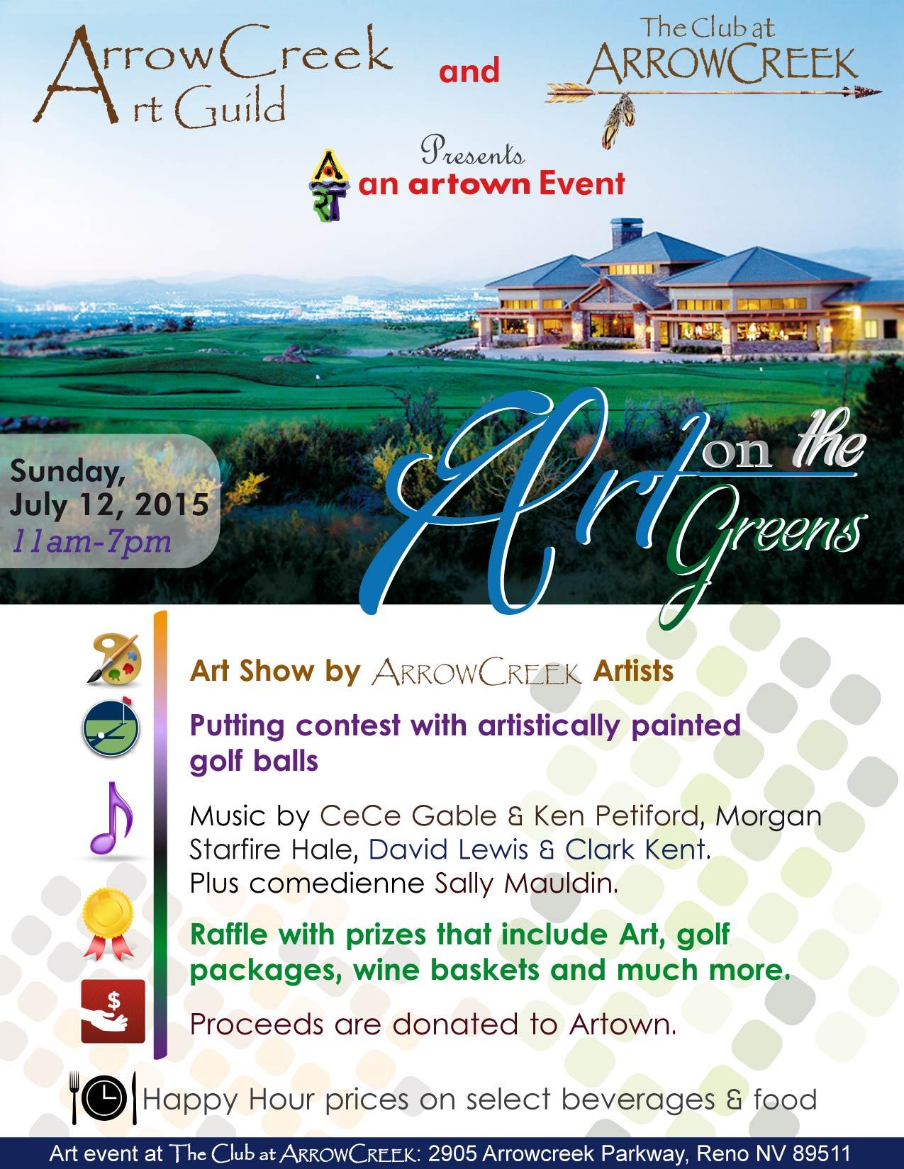 The ArrowCreek Art Guild is proud to announce, in conjunction with The Club at ArrowCreek, that their Art on the Greens Art Show will take place for one day only on Sunday, July 12, 2015, at the Club at ArrowCreek. Art on the Greens is one of the Reno artown official activities. Here is the artown calendar. Click on any day (for example: July 12!) to see the itemized schedule of events.