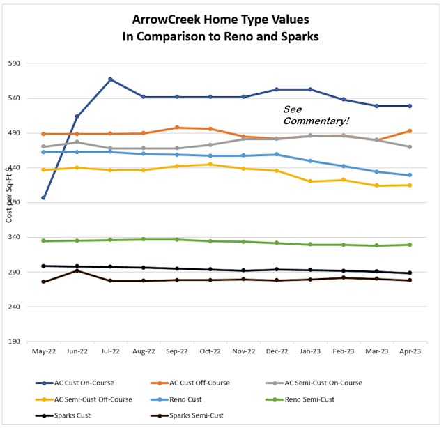 Continuing with the commentary from previous months: the author received queries about Semi-Custom and Custom homes both on and off the golf course and their relative selling prices with respect to those found in Reno and Sparks. The following chart portrays the trend lines for Custom and Semi-Custom homes within this broader community. From the chart below it is pretty clear that home values across the Truckee Meadows have been pretty stable over the past twelve months. It is also apparent that Custom homes in the broader Reno Custom Home market are now on par with ArrowCreek Semi-Custom and Custom homes on the golf course. ArrowCreek homes not adjacent to the golf course are exhibiting better values as they appear to be slightly smaller in size. Clearly, there is no real comparison to values in the Sparks market.