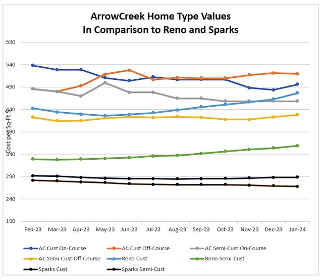 - Reno market ‘in general’ – Custom homes in Reno are selling, on average, for $476.73 per square foot (Median price $2,722,500). The average days on the market was 136 days. ArrowCreek average time on market was unavailable. Reno homes comparable to ArrowCreek Semi-Custom homes are selling, on average, for $358.94 per square foot (Median price $1,100,000) with a time-on-market of 122 days. Median prices rose across the Reno market by 4.6% during the comparable past year, as you can see from the chart, while ArrowCreek combined average, validated prices were 4.9% lower.