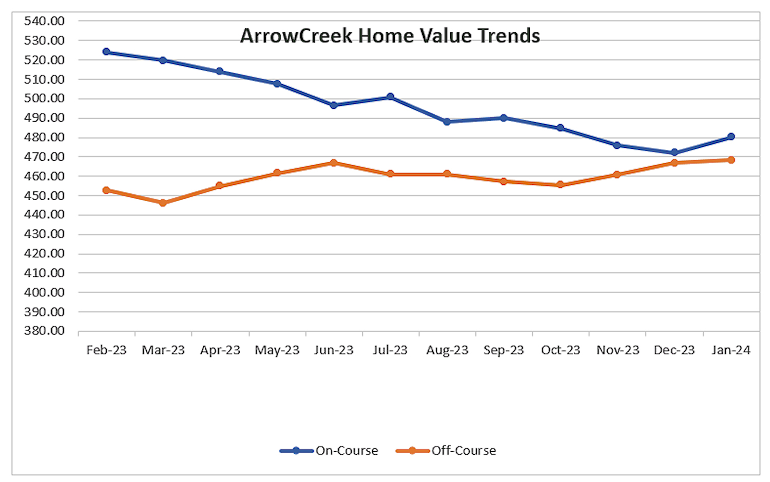 Some owners of ArrowCreek believe they reside in a ‘golf community’ and that’s fine. In fact, they reside in a small ‘village/HOA’ with governmental-like services. When you look at the chart above, you’ll notice it really doesn’t matter whether you have a golf course home or not. The values are almost indistinguishable. So the words of being a golf community appear to emanate from those who have chosen to belong to the ‘private’ golf club and that’s fine, too. In their minds, it may be true; however, in fact, the truth is that only a third of the homes and lots are on the golf course and approximately 33% of all owners are actually members of ‘The Club.’ Yes, we have a private golf club within our gated community that is not an HOA amenity, but we also enjoy the freedom to belong or not.