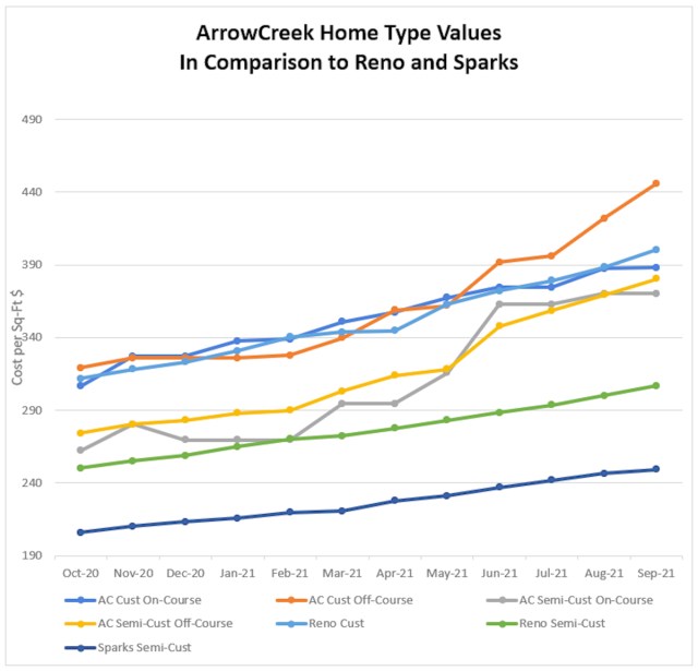 - Reno market ‘in general’ – Custom homes in Reno are selling, on average, for $462.48 per square foot (Median price $1,833,300). The average days on the market was 21 days. As noted from above, you can see our ArrowCreek comparable golf course Custom homes are selling at a discount to those in Reno, both custom and semi-custom. ArrowCreek average time on market was 63 days. Reno homes comparable to ArrowCreek Semi-Custom homes are selling for $334.64 per square foot (Median price $950,000) with a time-on-market of 14 days. Median prices rose across the Reno market by 20.2% during the comparable past year, as you can see from the chart, while ArrowCreek combined average prices were 21.4% higher. (Note: ArrowCreek appreciation is now very much in line with the Reno market.)