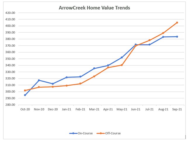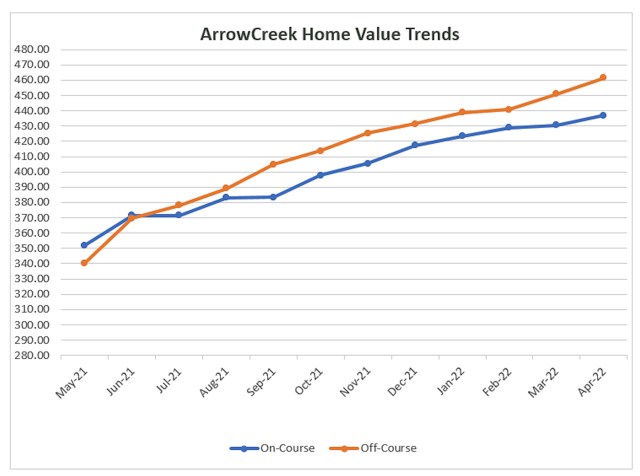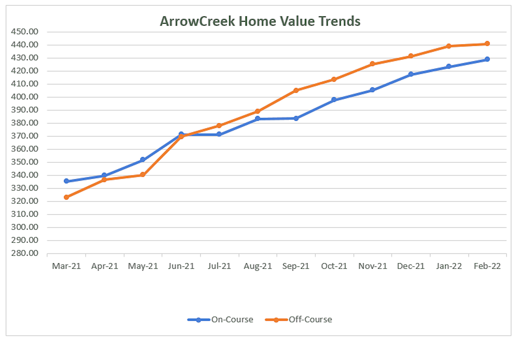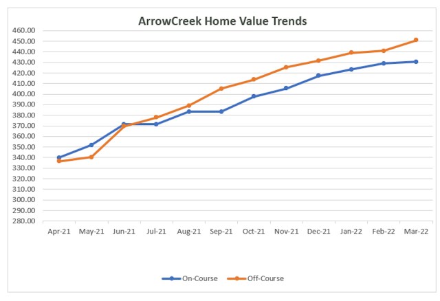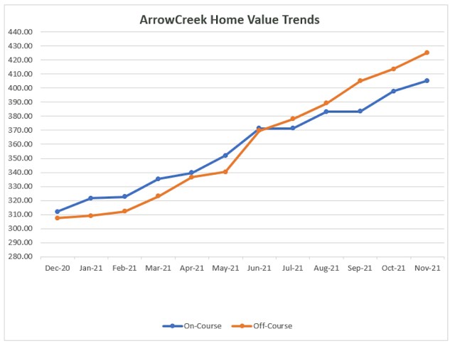 During this past month the number of properties changing owners was at a nominal rate of 8 (eight) properties. This data appears to be in agreement with national publications and local real estate and banking professionals. We did not make the list of the hottest local markets per Kiplinger, the Wall Street Journal, or the S&P CoreLogic Case-Schiller national home price index (20.6% increase), BUT our year-over-year price gain of 20.2% certainly puts ArrowCreek in line with the hottest markets in the country. Also, CNN reported that the hottest market in the country was Tampa with a 34.8% increase. ArrowCreek absolutely competes with the top markets. These eight (8) properties that changed owners over this past month had a total value of $12.5 Million! Only one of the properties were directly adjoining the ‘golf course.’ Currently ‘non-golf course homes’ enjoy a sales price advantage of 5.4% ($24.55 per square-foot) advantage over ‘golf course’ homes, with the advantage clearly noticed, as you’ll read below, in the value of custom homes. However, it was also noted that semi-custom homes ‘on-the-course’ are showing a higher value than custom homes ‘on-the course,’ an unexpected observation. This ‘advantage’ has now spread to undeveloped land as the price, as you will also read shortly, is only 4.5% higher for property that does not adjoin the golf course. Of course, ‘raw’ property adjoining the golf course has fallen statistically ‘out-of-contention’ since only one property was sold during the past year, in this category.