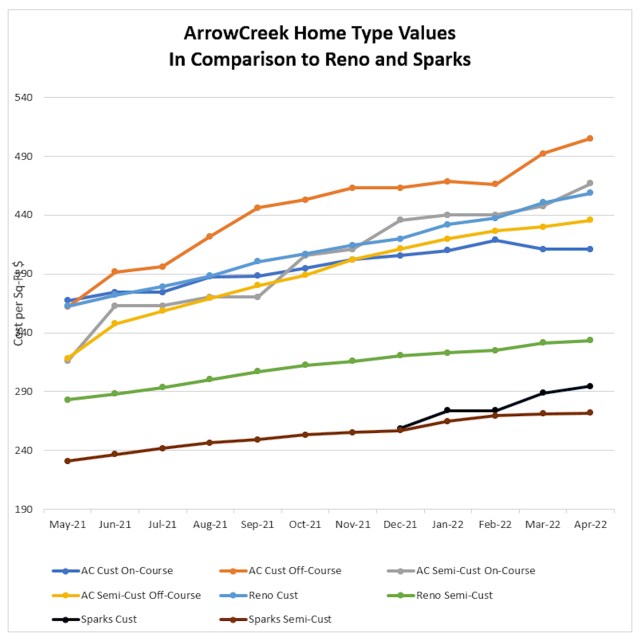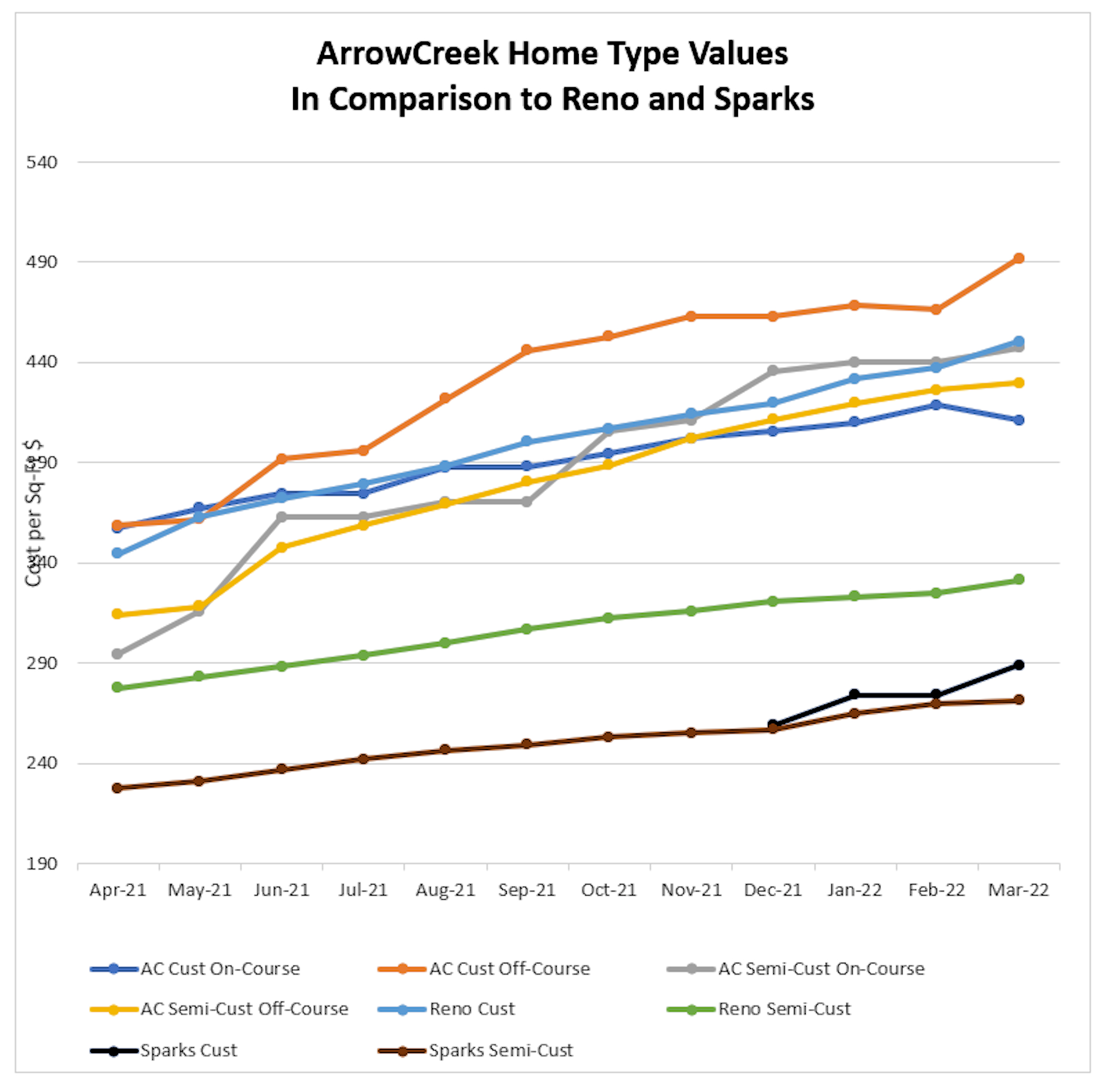 Continuing with the commentary from previous months: the author received queries about Semi-Custom and Custom homes both on and off the golf course and their relative selling prices with respect to those found in Reno and Sparks. The following chart portrays the trend lines for Custom and Semi-Custom homes within this broader community. From the chart it is clear that home values have been steadily increasing since June 2021. Furthermore, values of Custom homes within Truckee Meadows, especially those in Reno and on the ArrowCreek golf course, have managed to exhibit nearly the same values along with ArrowCreek Semi-Custom homes, both on and off the golf courses. However, as noted in the opening, only one home sold on the golf course in the past 3 months. Also, the value of Semi-Custom homes, of comparable home and land size, indicate that both Reno and Sparks offer greater value per square foot than ArrowCreek from a pure price perspective but not from a secure and safe environmental perspective. ArrowCreek’s value lies in our views, gated security, quality of adjacent schools and our other amenities which amounts to a premium of about $70 per square-foot for our Semi-Custom homes. Obviously, this is not true for our Custom homes as we enjoy the same ambience, but there is little price difference between Reno Custom homes and Custom homes on the golf course. However, those ArrowCreek Custom homes not on ‘the course’ exhibit a $40 to $80 advantage to both internal and external Custom homes.