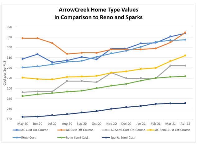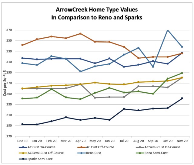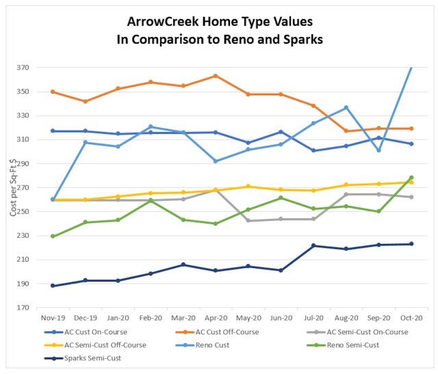 - Sparks market ‘in general’ – The top quartile in the Sparks market actually compares with the Semi-Custom homes in ArrowCreek. The median price for these Sparks homes is $241.87 per square foot (Median price $919,500) with an average of 21 days on the market. ArrowCreek Semi-Custom home averages are about $118 higher per square foot. Median prices rose across this market by 21% during the comparable past year. For the ArrowCreek community, the Semi-Custom homes rose 34% over the same time period.