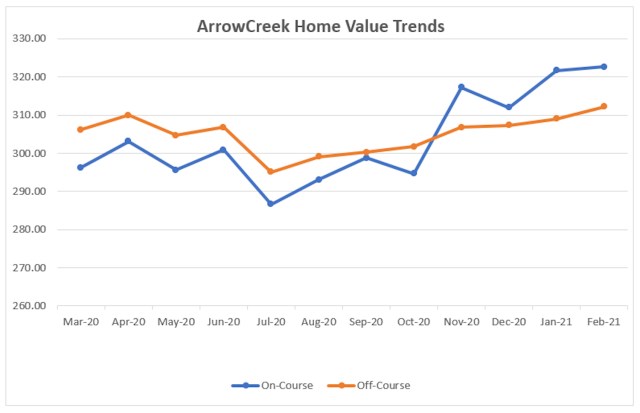 d.) The figure below shows the value trends over the past twelve months with the vertical scale being the cost per square foot. It should be noted that since July of 2020 prices have been steadily increasing across the ArrowCreek market.